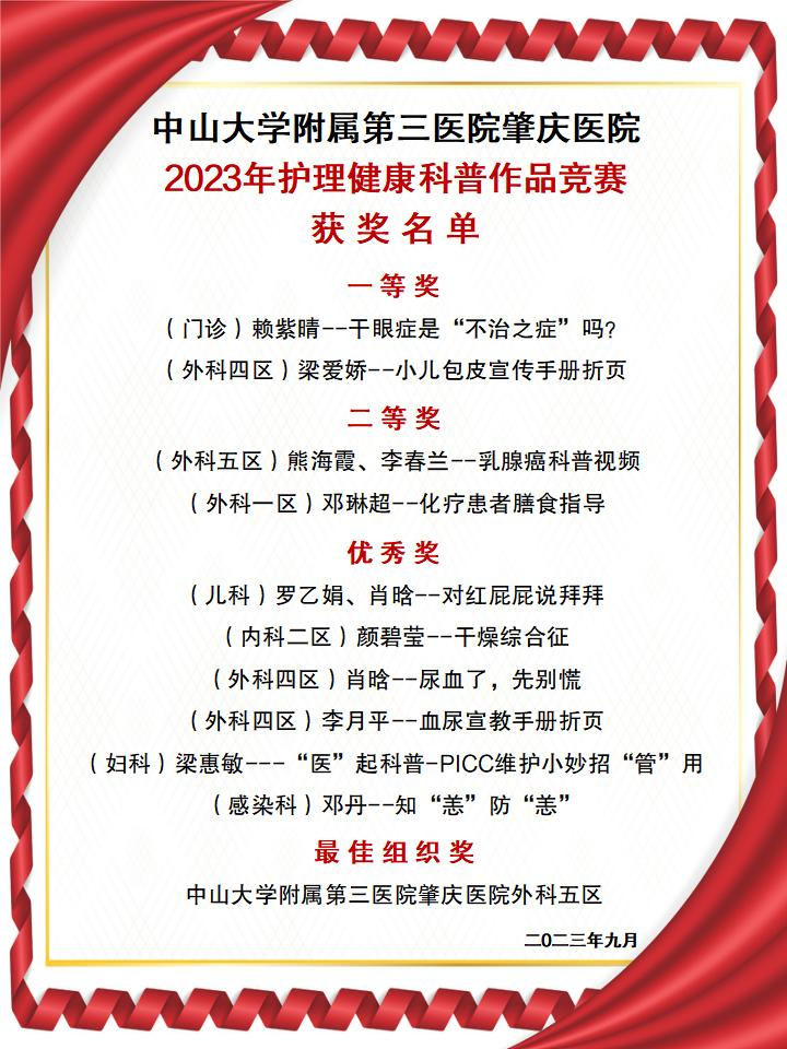 ? ? ? ? ? ? ? ? ? ? ? ? ? ? ? ? ? ? ? ? ? ? ? ? ? ? 中山大學(xué)附屬第三醫(yī)院肇慶醫(yī)院2023年護(hù)理健康科普作品競(jìng)賽獲獎(jiǎng)名單